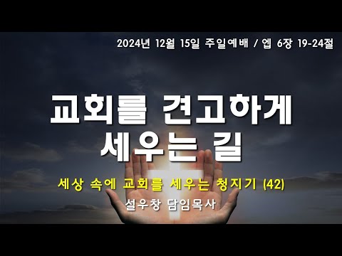 창의문교회창의문교회 2024.12.15 예배와 말씀 주일예배 [창의문교회 주일설교] 세상 속에 교회를 세우는 청지기(42) - 교회를 견고하게 세우는 길 본문: 에베소서 6:19-24제목: 교회를 견고하게 세우는 길설교자: 설우창 목사[온라인 일용할양식]설교를 듣고 온라인으로 제출해 주시기 바랍니다.https://forms.gle/..
