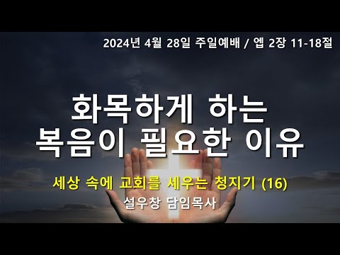 창의문교회창의문교회 2024.04.28 예배와 말씀 주일예배 [창의문교회 주일설교] 세상 속에 교회를 세우는 청지기(16) - 화목하게 하는 복음이 필요한 이유 본문: 에베소서 2:11-18제목: 화목하게 하는 복음이 필요한 이유설교자: 설우창 목사 [온라인 일용할양식]설교를 듣고 온라인으로 제출해 주시기 바랍니다.https://forms..