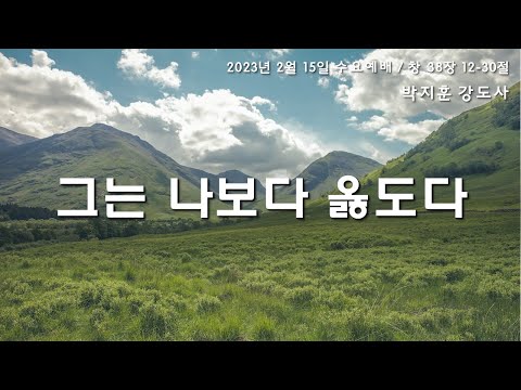 창의문교회창의문교회 2023.02.15 예배와 말씀 수요예배 [창의문교회] 2023년 2월 15일 수요예배 - 그는 나보다 옳도다 [창 38:12-30] 본문: 창세기 38:12-30제목: 그는 나보다 옳도다설교자: 박지훈 강도사* 창의문교회 주보 안내 *https://pf.kakao.com/_tqqzj* 창의문교회 홈페이지 안내 ..